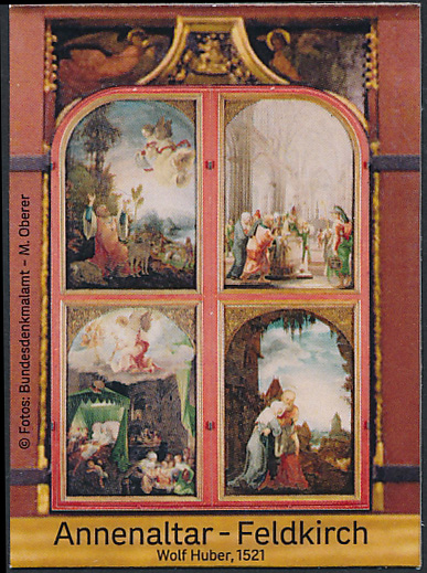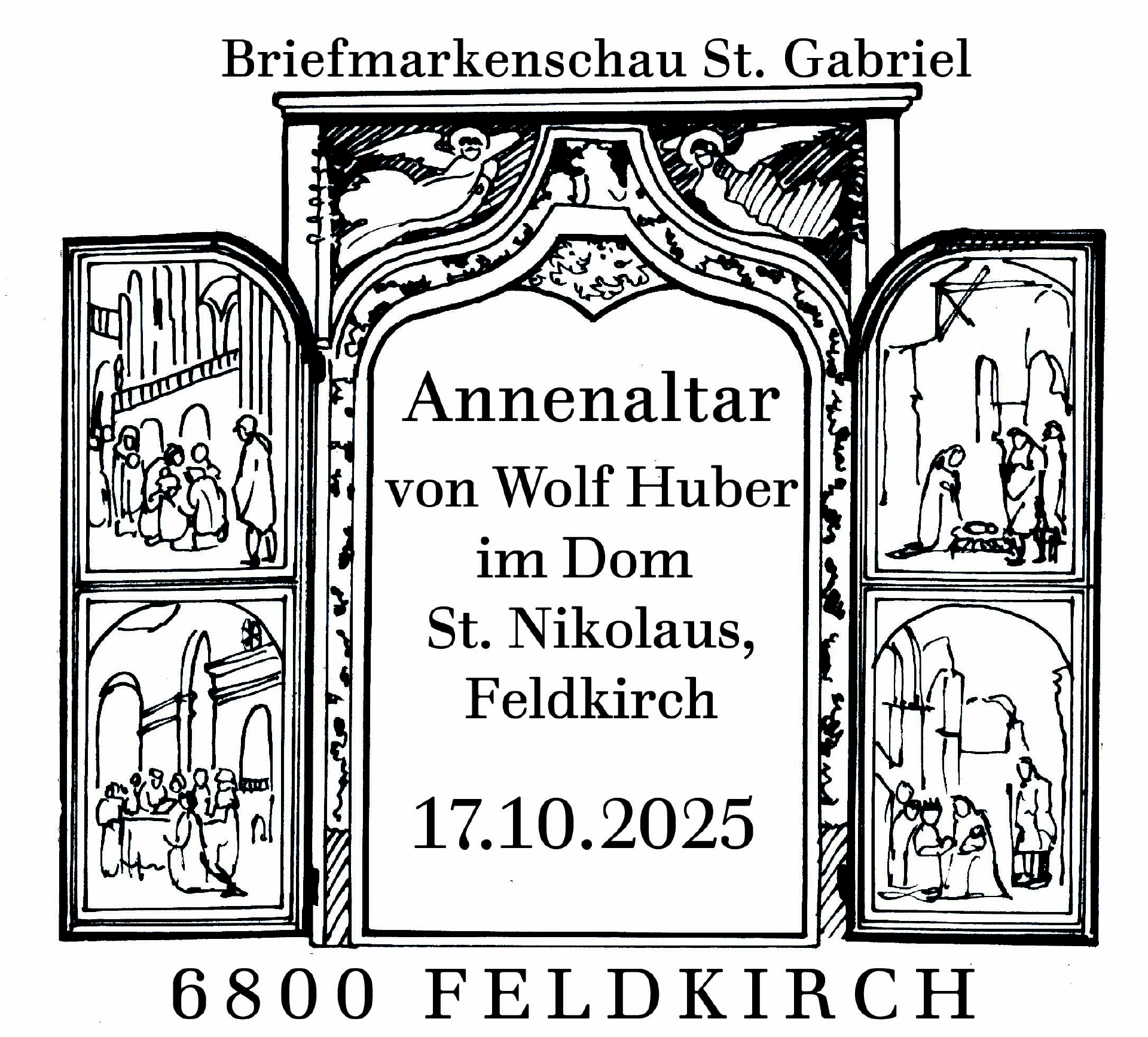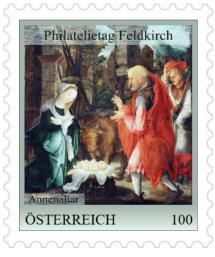 Aus diesem Anlass werden am 17. Oktober 2025 von 9 bis 13 Uhr in den Räumlichkeiten der Dompfarre Feldkirch (Domgasse 6) ein Sonderpostamt der österreichischen Post AG und eine Briefmarkenschau der Gilde St. Gabriel eingerichtet. Um 10 Uhr wird der neue Sondermarkenblock direkt im Angesichte seiner Originalvorlage im Dom zu Feldkirch offiziell präsentiert. Die Gilde St. Gabriel wird an diesem Tag neben Ersttags-Belegen mit dem neuen Sondermarkenblock auch eine personalisierte Briefmarke auflegen, die das Predella-Bild des Annenaltars - das Antlitz Christi am Schweißtuch der hl. Veronika (Vera Icon) – zeigt. Die Philatelietag-Marke zeigt mit der Epiphanie (Anbetung der hl. drei Könige“ ein weiteres Motiv aus dem Annenaltar! Bestellungen von phil. Belegen und pers. Briefmarken sind bei Hans Soriat, Am Golfplatz 16, 5310 Mondsee, bestellungen@st-gabriel.at bzw. unter 0664/9242994 möglich!